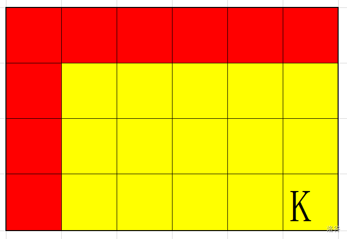 方阵如上图,其中每个格子的颜色为这个位置上同学的帽子颜色;“K”是小 K 的位置。