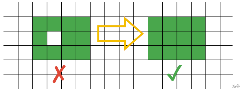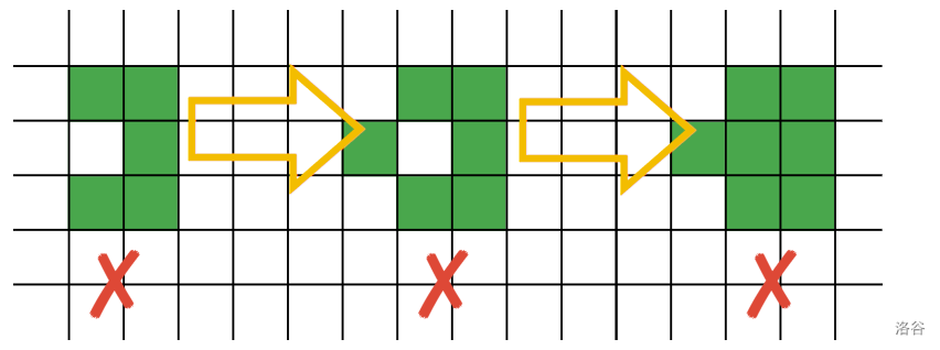 See below for another example. In this case, . Note that the middle figure prepares a cell outside the rectangle, so although the rightmost figure prepares a rectangle of size , the entire set of the prepared cells does not form a rectangle (due to the extra cell on the left). As a result, the orchard is not ready.