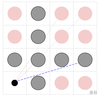 Your friend Cody-Jamal is working on his new artistic installment called "Gallery of Pillars". The installment is to be exhibited in a square gallery of by meters. The gallery is divided into squares of 1 by 1 meter, forming an by matrix. The exact center of the southwest corner cell is called the viewpoint; a person viewing the artwork is supposed to stand there. Each other cell contains a cylindrical pillar. All pillars have two circular bases of radius : one resting on the floor, in the center of its corresponding cell, and the other touching the gallery's ceiling. The observer will stand in the viewpoint, observe the pillars, and marvel.