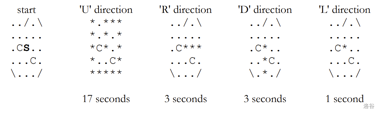 The first line of output must contain the required optimal broadcast direction ("U", "R", "D", or "L"). If the solution is not unique, select the first optimal one in the following priority order: first "U", then "R", then "D", and finally "L".