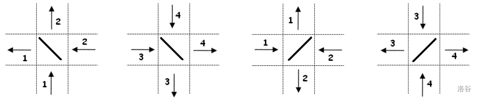 Upon being broadcast, the signal propagates in a straight line along the same row/column until it reaches a planet, where it is deflected by 90 degrees in another direction. There are two kinds of planets, which we will denote by "/" and "\". The deflection rules are shown in the image below: