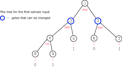 The first lines describe the interior nodes. Each line contains and , each being either 0 or 1. If is 1 then the gate for this node is an AND gate, otherwise it is an OR gate. If is 1 then the gate for this node is changeable, otherwise it is not. Interior node has nodes and as children.