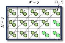 The first line of input gives the number of cases, . test cases follow. Each case contains four lines. The first line is the size of the grid of mousetraps (equal to the size of the room), given as its width and height . The next two lines give the destinations of the two ping-pong balls, as an and displacement. For example, if the two lines were and , then triggering a mousetrap would launch two balls; one would hit the mousetrap just up from the triggered mousetrap, and the other would hit the mousetrap that is up and to the right of the triggered mousetrap. The final line has two integers specifying, respectively, the column and row of the mousetrap set off by the original ping-pong ball (where would be the bottom left mousetrap).