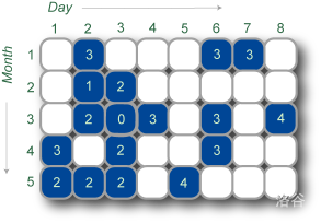 The picture below depicts a calendar with 5 months, 8 days in each month, 15 blue days, and 5 question marks.