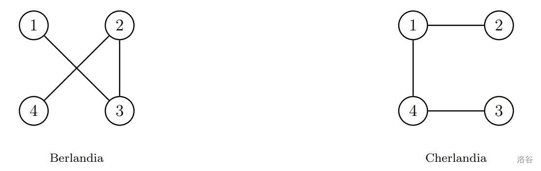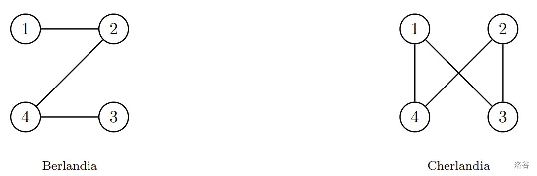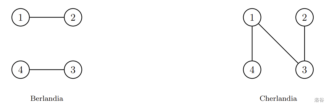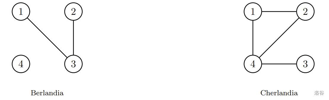 In the third set of input data, after casting a spell on cities and , the road between these two cities in Berlandia ceases to be illuminated, as it was illuminated before. In Cherlandia, on the contrary, the road becomes illuminated. After this operation, the countries will have the following structure: