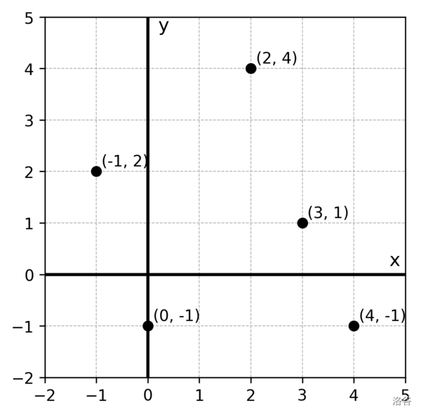 例如,假设给定如下图所示的 5 个点:。点本身没有大小,但在图中为了方便观察,用圆形表示。