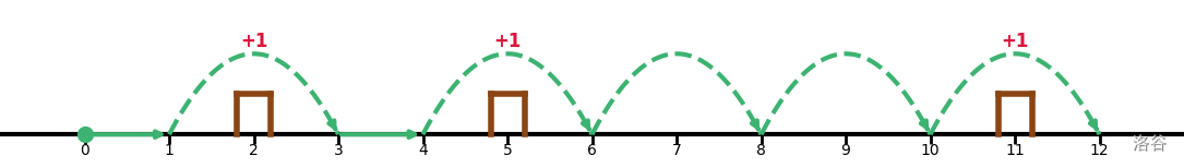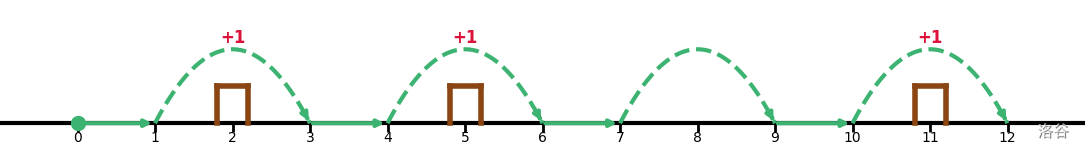 方法 1: $0 \rightarrow 1 \implies 3 \rightarrow 4 \implies 6 \rightarrow 7 \implies 9 \rightarrow 10 \implies 12$ (共移动 8 次,跳过 3 个障碍物)