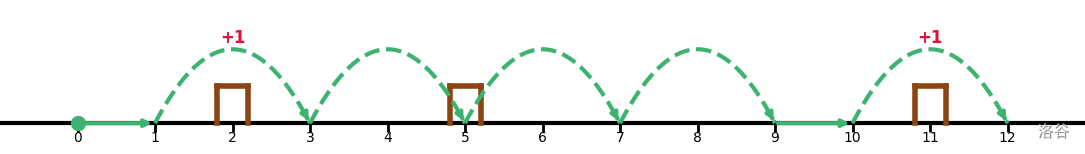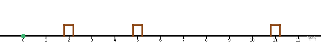 例如,假设如下图所示,在数轴上的位置 2、5、11 处放置有障碍物。