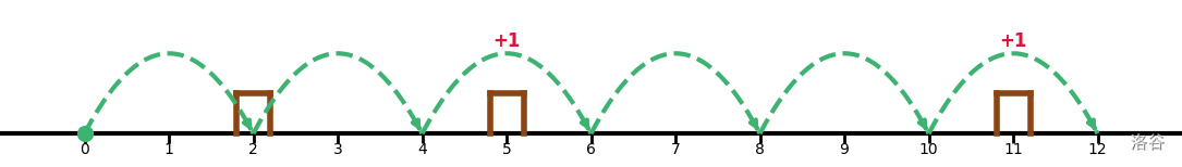 方法 2: $0 \rightarrow 1 \implies 3 \rightarrow 4 \implies 6 \implies 8 \implies 10 \implies 12$ (共移动 7 次,跳过 3 个障碍物)