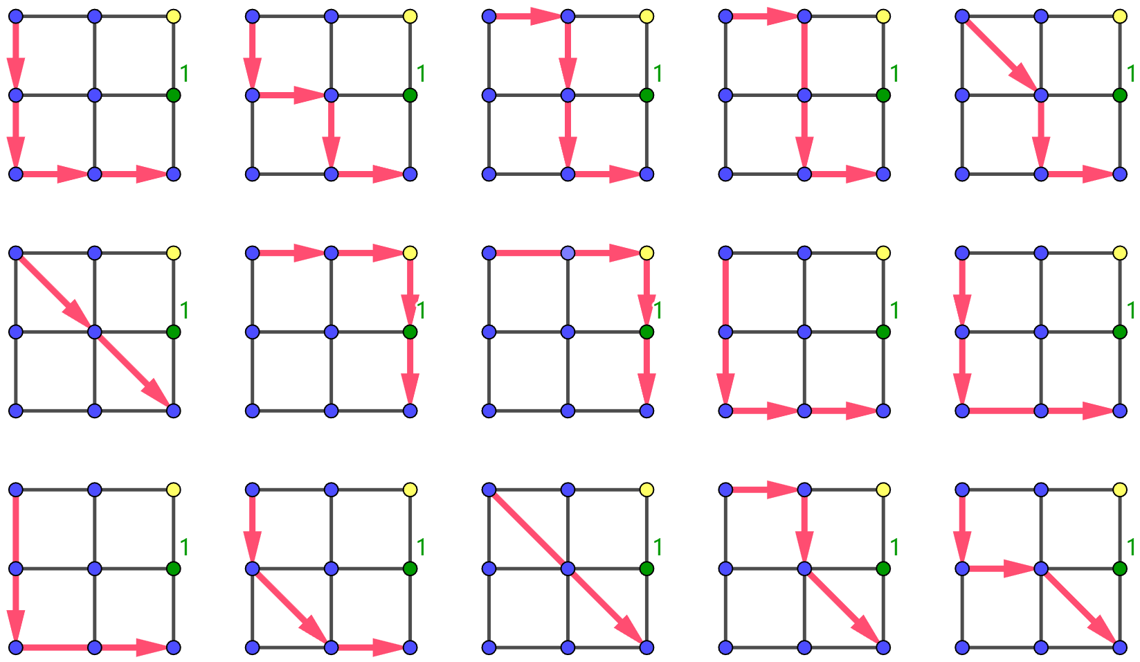 以下 5 种方案不合法,因为在这些方案中,小 L 到 (2,3) 后 w=−1<0: