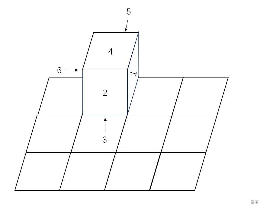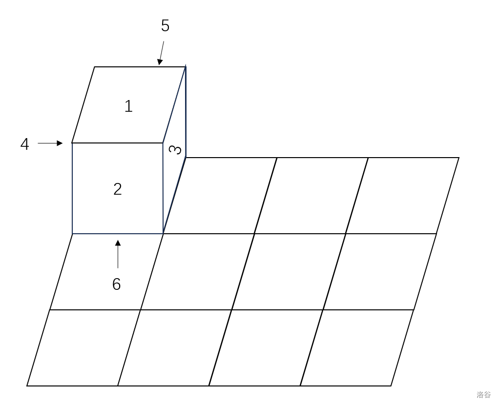 在 行 列的网格的最左上角的格子上,有一个边长和网格格子边长相等的骰子。初始,这个骰子 在顶面, 朝前, 朝右, 的背后是 ,如下图所示。