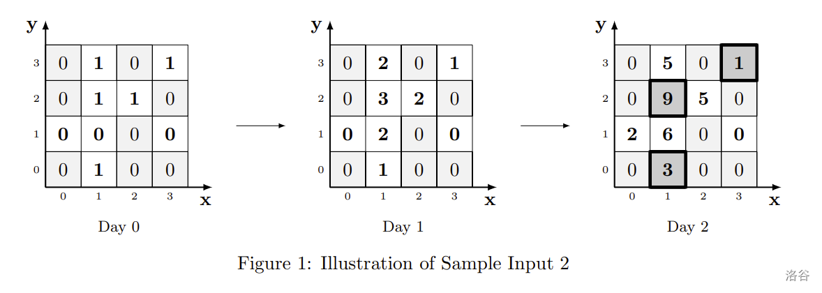 The park consists of flower tiles with coordinates ranging from to in either direction. A tile on coordinates neighbors with tiles on coordinates , , and (within coordinates range). On the first day, the gangsters may cut the flowers on any of the tiles. Also only on the first day, if a tile is cut, the gangsters may either plant a tobacco on it, or let the tile contain only grass. In the beginning, the tobacco quantity on a tile with tobacco is and the tobacco quantity on a tile with grass or on a tile with flowers is . Local tobacco spreads rather aggressively, and so on each consecutive day, the tobacco quantity on park tiles grows as follows: