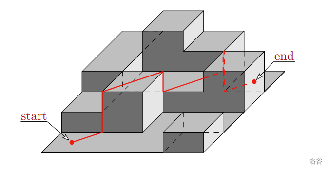 - The height of any point on the path is bigger than or equal to the lowest height of roofs of all blocks to which surface the point belongs.