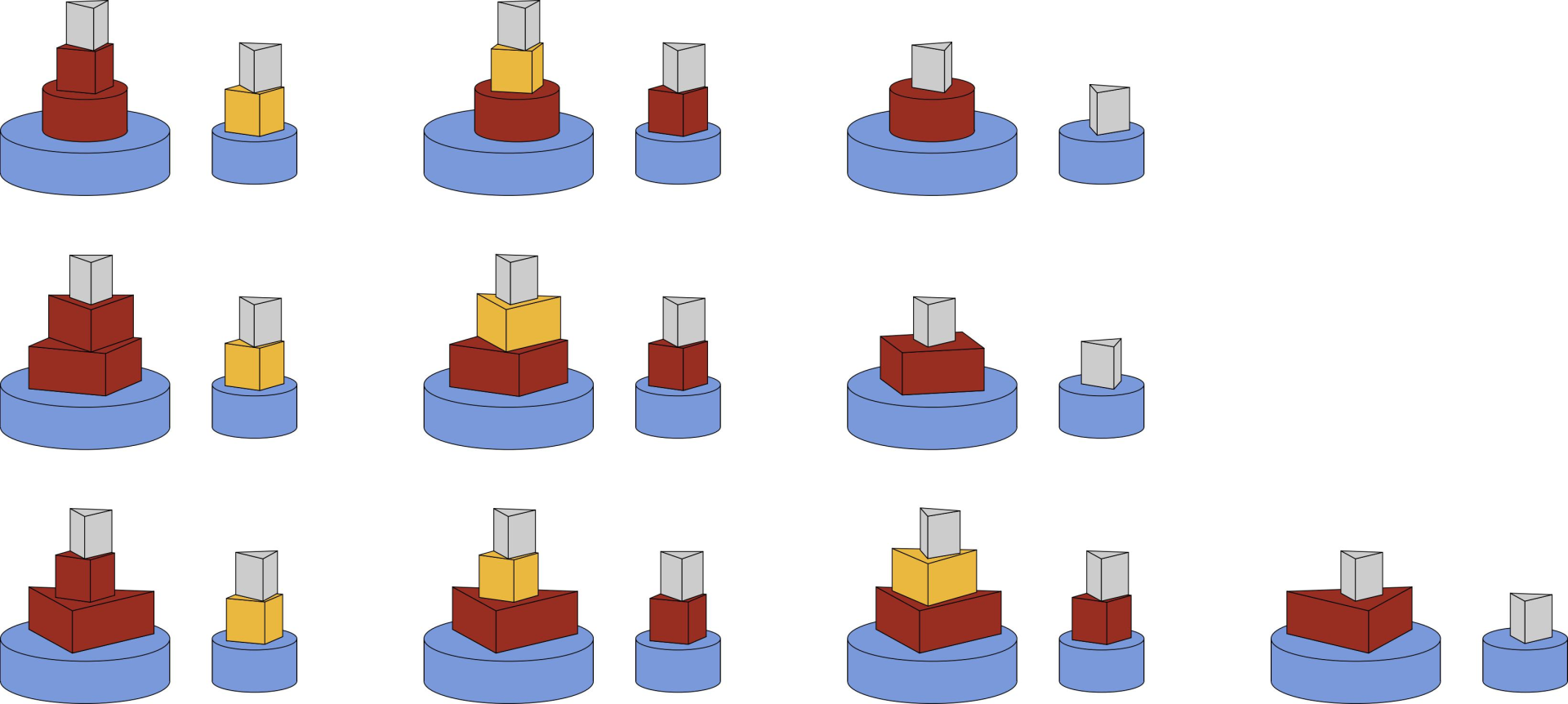 Figure A.2: Illustration of Sample Input 2, showing all possible end configurations of the game when Peter went first and played optimally to win. The blue blocks are the initial configuration. Peter needs to put one of , or on top of in order to win. Each of these options corresponds to one row of the figure. Blocks placed by Peter are coloured in red, and blocks placed by Amy are coloured in yellow. As the last two blocks are always of type , they are shown in grey. If, for instance, Peter first puts (as depicted in the first row), then Peter can win by mirroring the following moves by Amy.