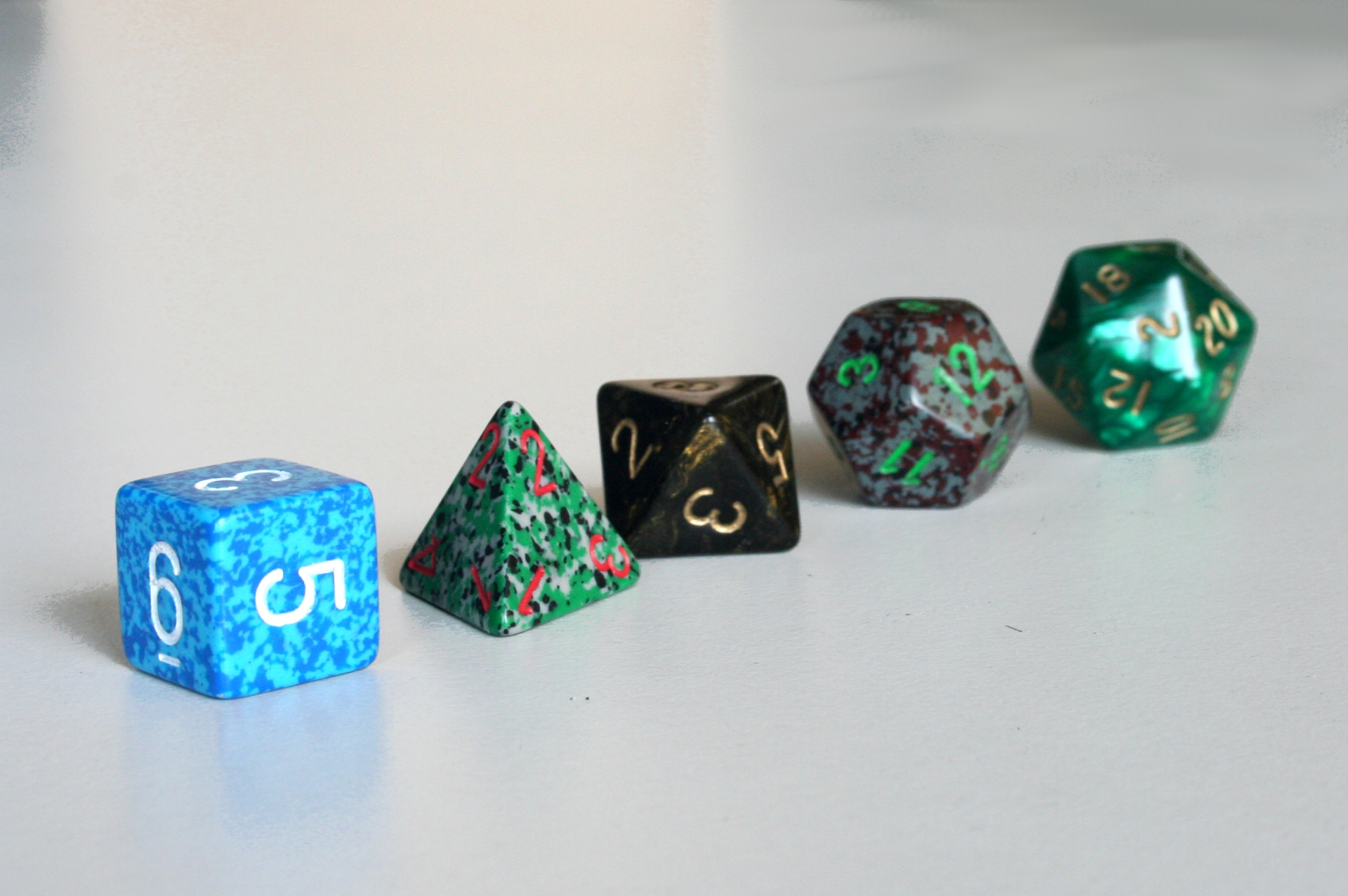 In Dungeons & Dragons (DnD) and many other role playing games, many actions are determined by dice rolls, and it is also quite common to use dice with different numbers of sides. The most common dice are those based on the five Platonic solids, the tetrahedron, cube, octahedron, dodecahedron and icosahedron, with , , , and sides, respectively. In DnD terminology, these dice are usually called d4, d6, d8, d12 and d20.