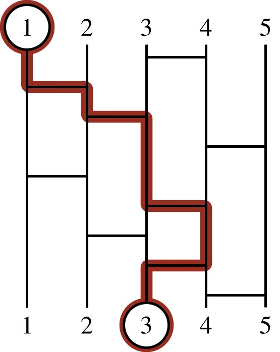 Amida-kuji is a lottery popular in Japan, which can be used to assign prizes to people. The game consists of vertical lines, called legs, and some horizontal bars that connect adjacent legs. The tops of the legs are the starting positions of the people, and the prizes are at the bottom of the legs. To determine the prize of the th person, one has to move down on the th leg, starting at the top, and switch the leg whenever a horizontal bar is encountered. You can see such a game and how to trace a path in Figure J.1.