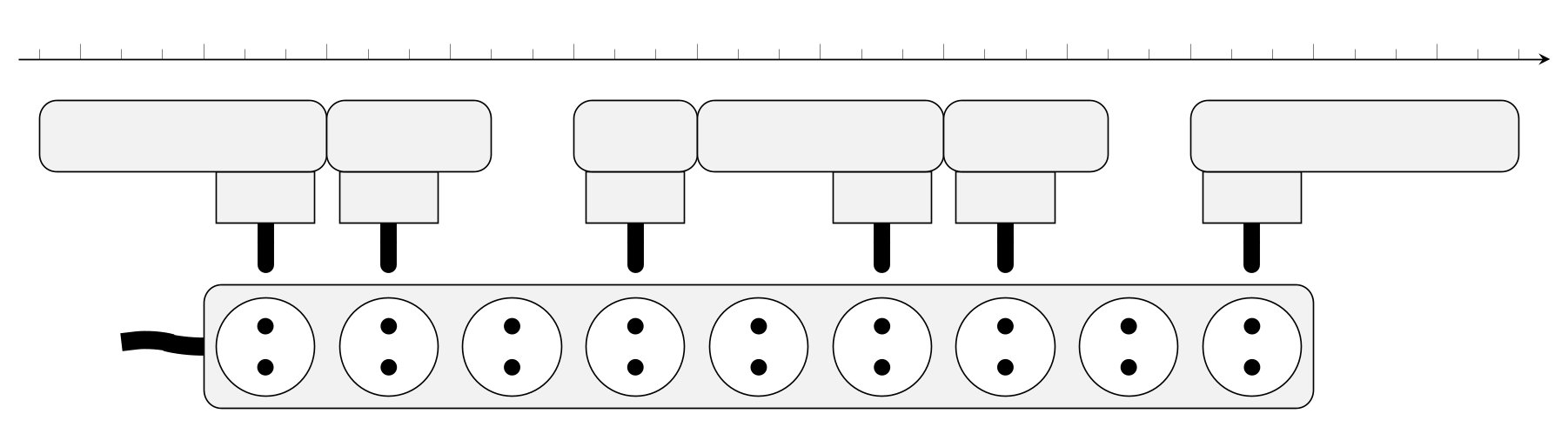 Your power strip comprises a row of sockets, and each socket is in diameter. Furthermore, as you examine the chargers, you notice that they all have integer lengths. The plug of each charger is always on one of the two ends, and each charger can only be used in two orientations. Chargers cannot overlap, but can touch, and can extend beyond the end of the power strip as long as they are plugged in to a socket. This is visualized in Figure A.1. Hoping that this allows them to avoid the training, your friends agree to write a program to solve this.