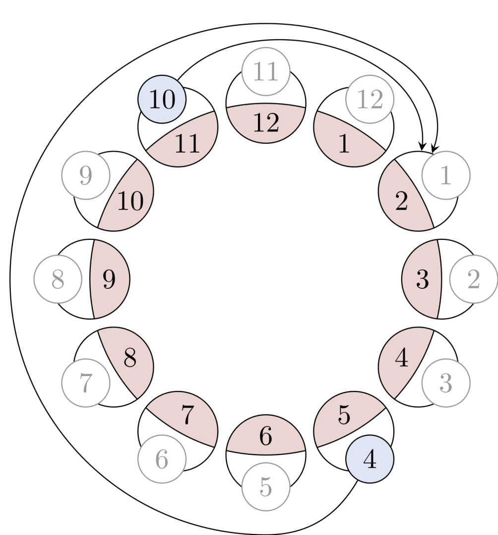 If two or more people want to move to the same chair, then the player needing to travel the least in clockwise direction to reach the chair gets to take the seat, and the other players trying to reach the same chair are out of the game. This is illustrated in Figure C.1, where the larger circles represent the chairs and their numbers are written on their inside. The smaller circles represent the players. The next command () tells player (now on seat ) and player (now on seat ) to move to chair . However, since player needs to travel less, this player gets to take the seat. Note that the other players will also move to some other chairs, but this is omitted from the figure for the sake of readability.