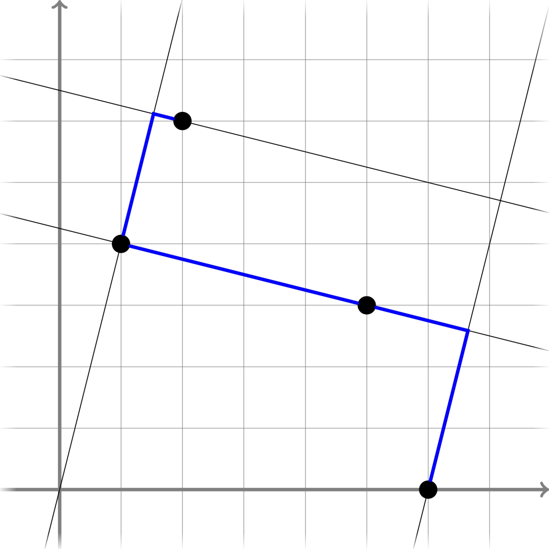 Some stroopwafel bakeries have already been built in New Delft, but none of the streets have been constructed. Your task is to lay out the grid of streets. For this, you need to decide on an orientation for the grid so that there are two orthogonal directions for the two types of streets. Once the orientation is fixed, you may build arbitrary streets, as long as each of them has one of the two given directions, as shown in Figure J.1. Each street can be traversed in either direction.