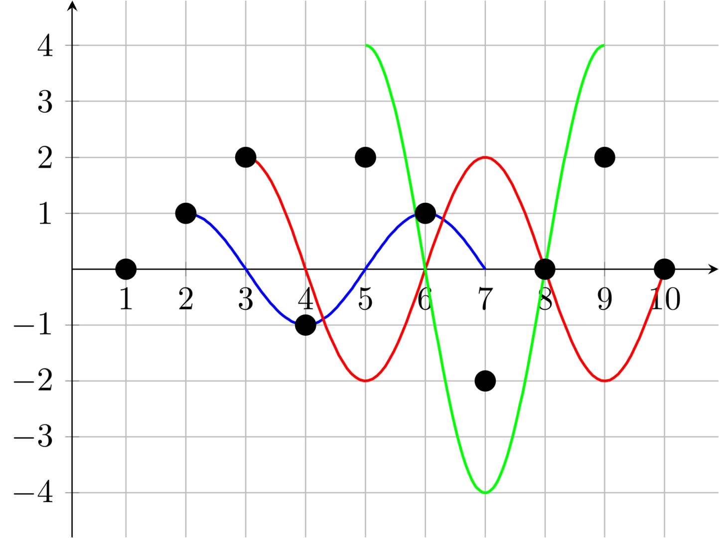 Figure I.1: Interference of three waves in Sample Input 2. The black dots represent the resulting wave’s height. :::