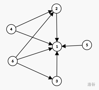 E(6)=2,T(6)=2,因为从 6 号节点到 1 号节点最多可以经过 2 条边,其对应的 2 条最长路径分别为 6→3→1 和 6→2→1。同理可知,E(4)=2,T(4)=1。