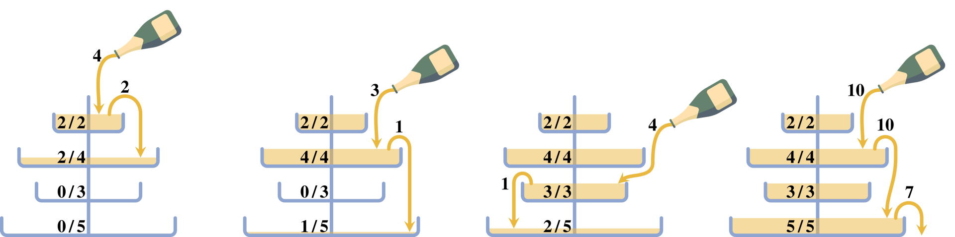 Last week, Bill filled a champagne fountain for the first time. Delighted by the champagne pouring from one glass into another, he decided that he wants to organize an even bigger champagne fountain for the next World Finals. He already ordered glass bowls with different capacities to stack on top of each other to form a huge glass fountain. However, he is still unsure how to pour the champagne into the fountain. One bottle will not be enough and just pouring from the top might not fill every bowl. Bill wants to try out different ways to fill the fountain, but wasting any champagne would be such a shame.