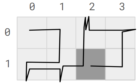 上图展示了样例 中最小可能的网格。机器人沿黑色曲线移动。深色方块是机器人最终的位置。