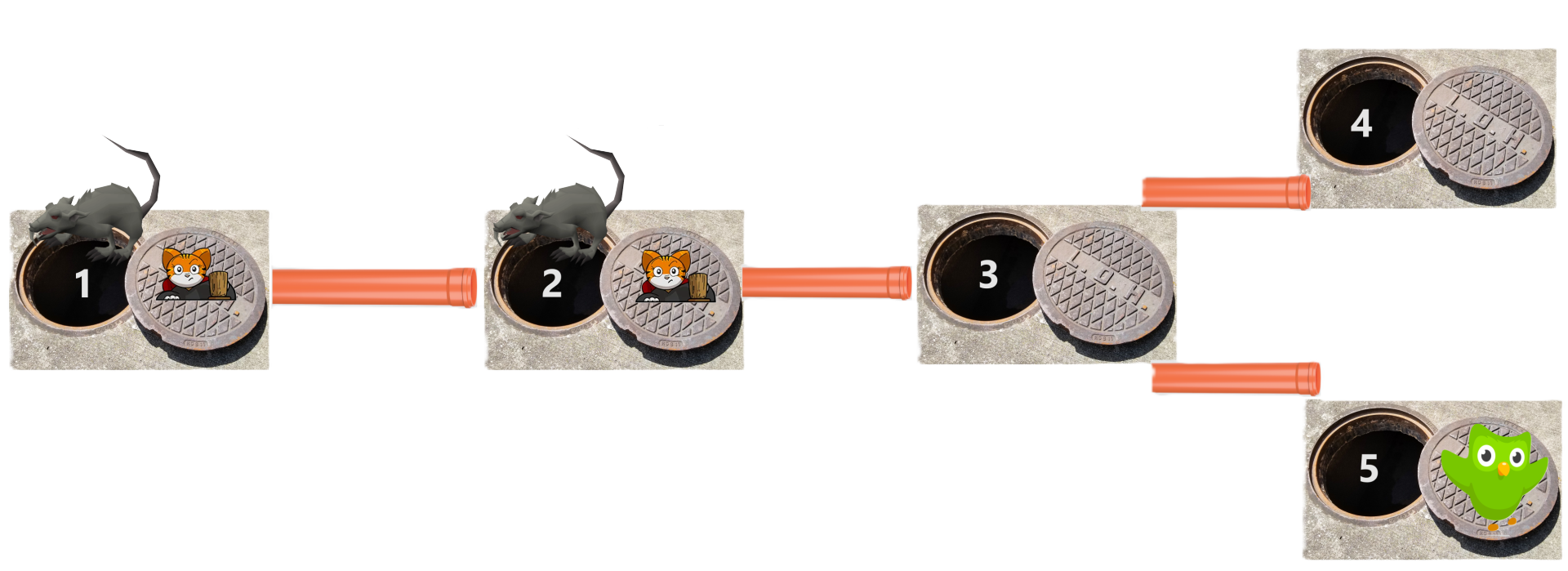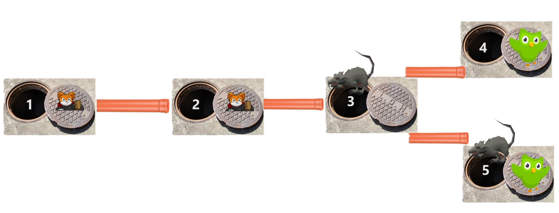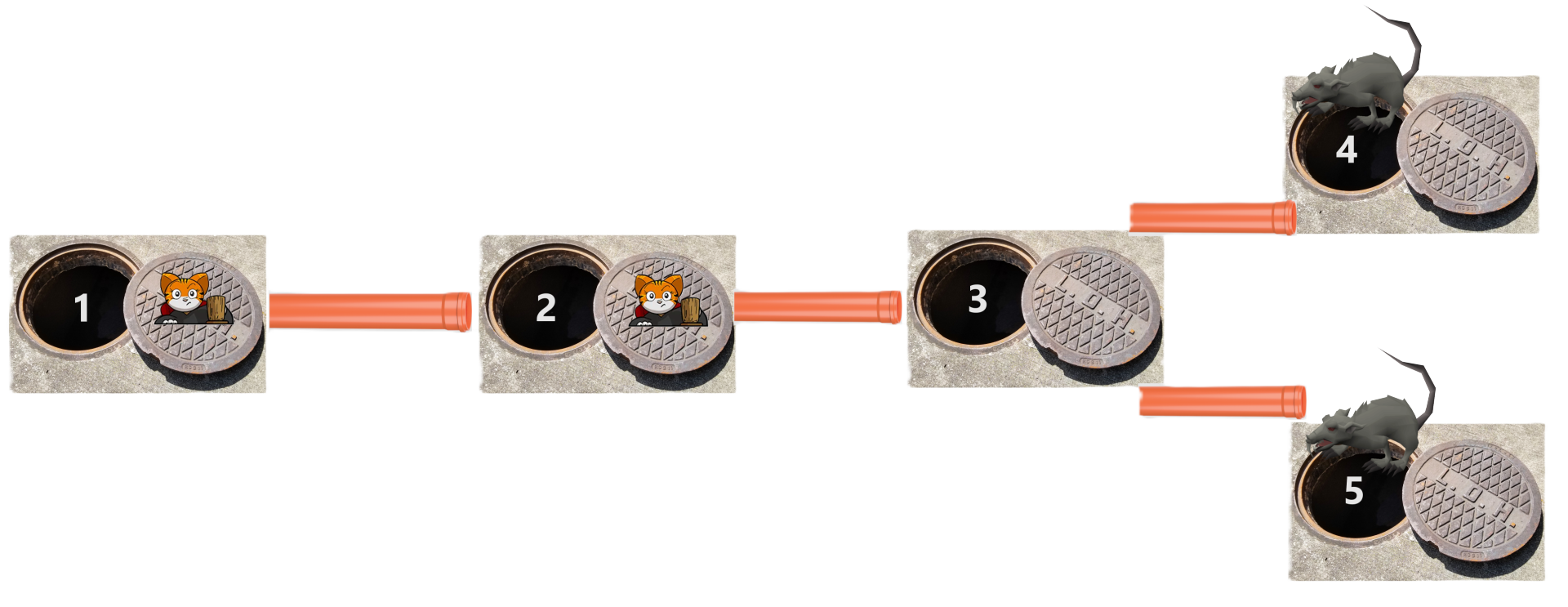 图 4: 当你再次在沙井 5 放置一个 OWL 时,首先沙井 2 中的老鼠逃到沙井 1,然后沙井 3 中的老鼠逃到沙井 2。
