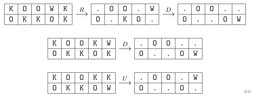 相似地,袋鼠可以被键盘上的 U,D,L,R 键控制。所有袋鼠会同时根据按下的按键移动。具体来说,对于一只位于第 行第 列的格子(用 表示)上的袋鼠: