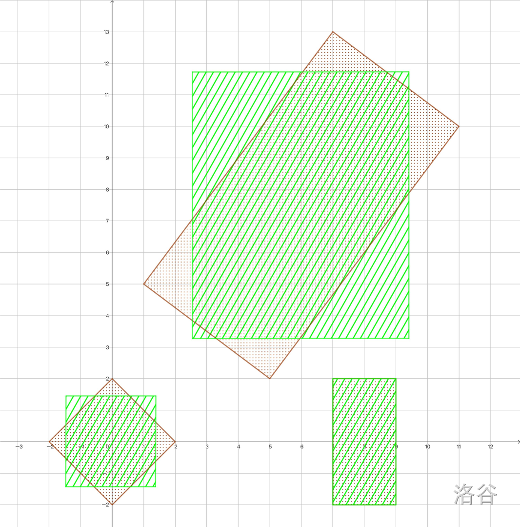 样例数据解释如下。输入的矩形用点状阴影表示,最优的轴对齐矩形用斜线阴影表示。