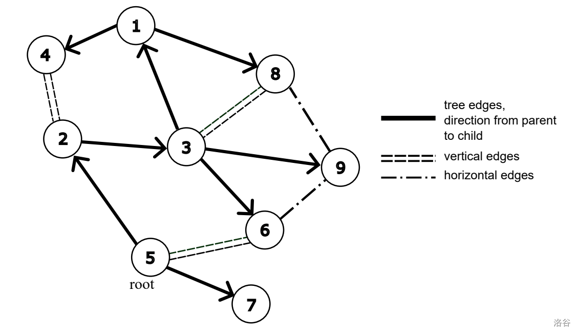 If a root and a spanning tree are fixed in the graph, then all edges of the graph can be divided into three types: