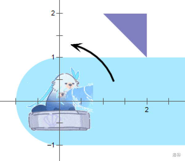Each battle scenario happens on a two-dimensional plane. Neuvillette stands on facing initially, making a charged attack which lasts for units of time, and rotates rad counter-clockwise per unit of time. That is to say, Neuvillette turns a circle counter-clockwise in units of time.