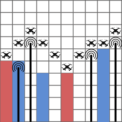 这场比赛举世闻名,因此有许多无人机来回飞行拍摄这些漂亮的塔。为了避免无人机与塔相撞(从而把与其相撞的那一块及其上方的所有乐高块都撞掉),摄制组沿着 轴放置了许多高度各异的无线电桅杆。无人机每向前移动一格,可以向上或向下移动一格,并且总是尽量贴近地面飞行(以获得更好的画面),但绝不会低于任何桅杆的高度飞行。