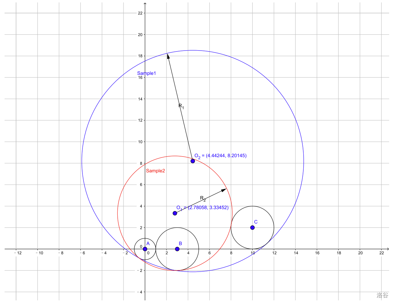 Chiaki found three distinct points , and in the plane. And she also knows the shortest distance from each point to the circumference.