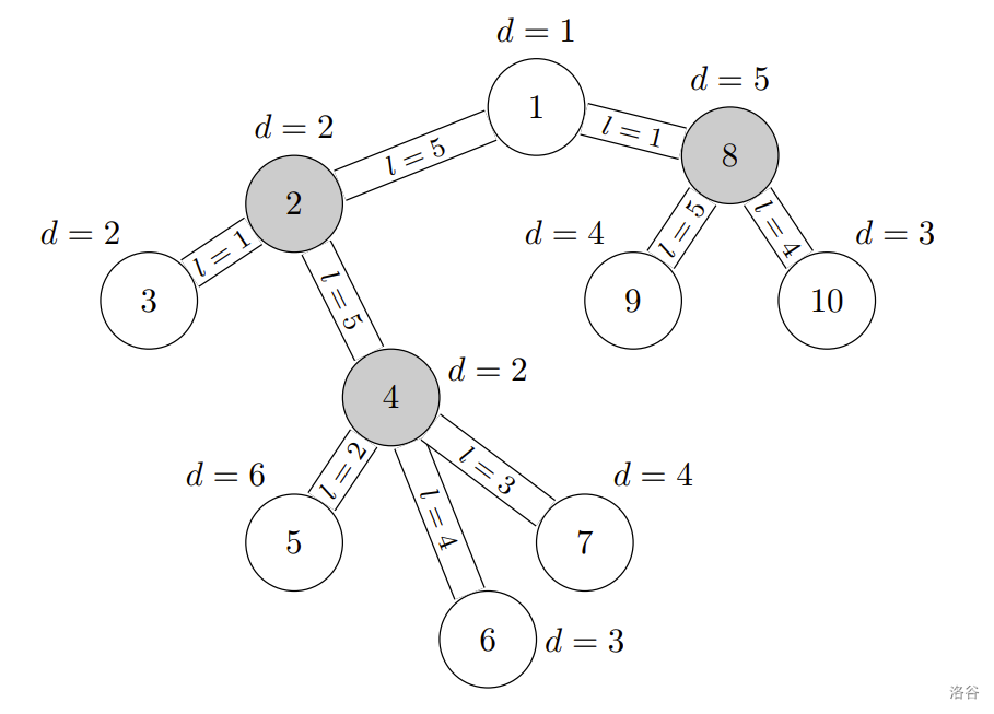 一个地下掩体由 个房间组成,这些房间通过 条走廊相连。每条走廊连接两间不同的房间,并具有一定的长度。掩体的结构保证了从任意一个房间 都可以到达另一个房间 。注意,存在且仅存在一条路径,使得在该路径中没有任何走廊被重复经过。由这些走廊长度的总和定义为房间 与房间 之间的距离,记作 。