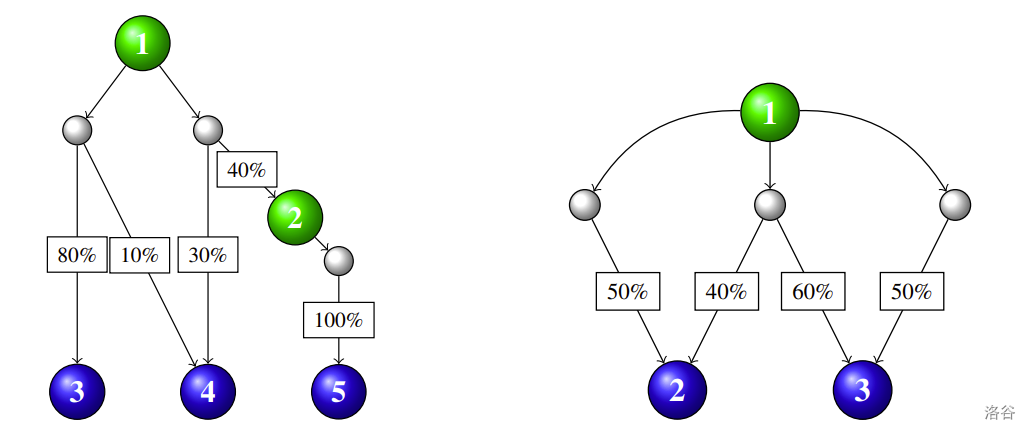 Figure C.1 illustrates the two sample inputs. Stations and reservoirs are shown as numbered nodes, colored green for stations and blue for reservoirs. Ducts are depicted as white nodes. For example, in the first sample input (left), Flubber can be sent from station 1 in any proportion to its two downstream ducts, but each duct will distribute its inflow according to the percentages printed on its outgoing edges.