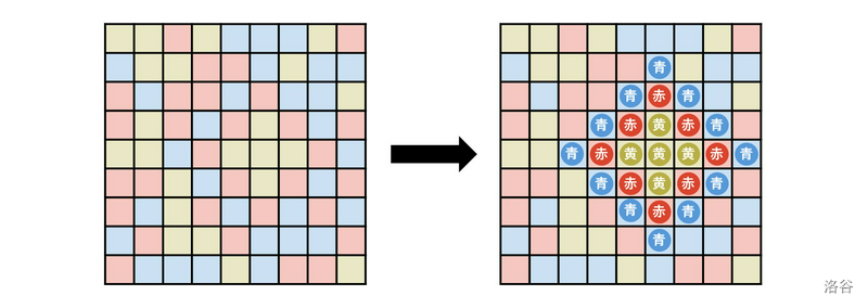 若取 ,中心 ,并选择 为黄色、 为黄色、 为红色、 为蓝色,则可如图所示种植 25 朵花。图中背景色表示各区域可种植的花的颜色。