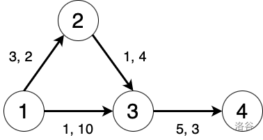 JOI 王国的城市与道路示意图如下所示。圆圈代表城市,箭头代表道路,每条道路旁标注了其对应的 和 的值(按此顺序)。圆圈内标注的数字代表该城市的编号。