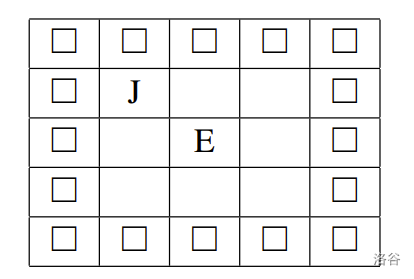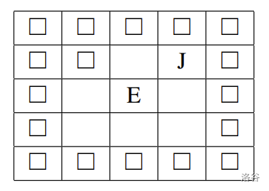 在输入样例 1 中,溜冰场的初始状态如下所示。标有白色方块的格子表示冰块,标有 'J' 的格子表示 JOI 君的当前位置,标有 'E' 的格子表示出口。