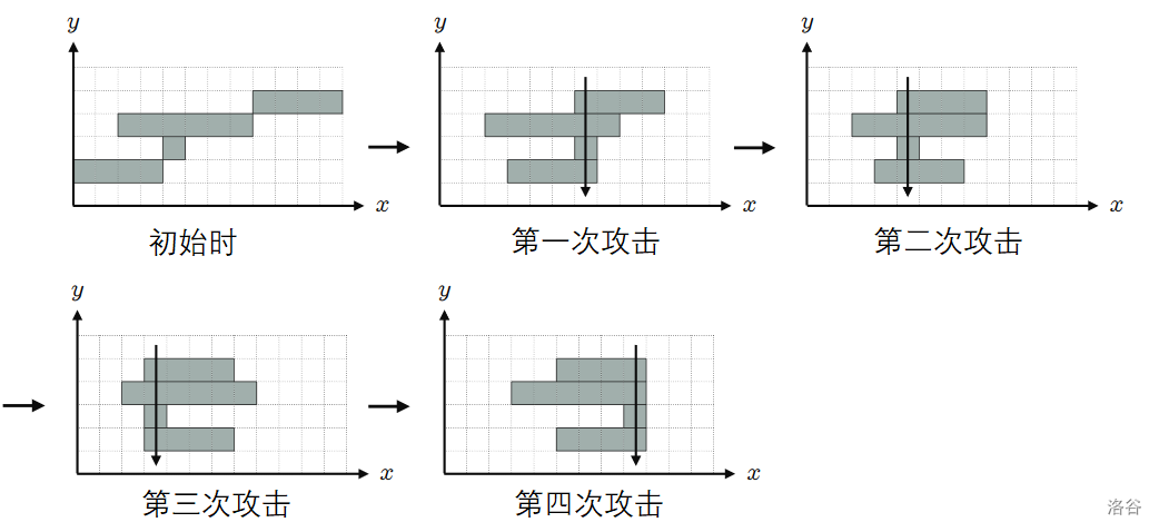 每个屏障占据若干个 坐标相同的格子,形成一个宽度为 、高度为 1 的长方形。屏障 ()在关卡开始时占据从格子 到格子 的区域。在敌人第一次攻击前,以及每次攻击之间的间隙,你可以随时将任意一个屏障向左或向右移动一格。每次移动只能将一个屏障向右移动一格,或向左移动一格。