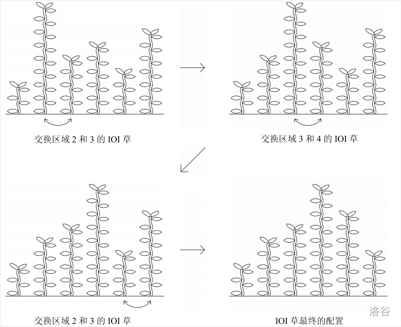 由于 IOI 草价值昂贵,且植株高大、枝叶纤细,JOI 君一次只能交换相邻的两株 IOI 草。也就是说,一次操作中,JOI 君可任意选择区域 (),并交换区域 和区域 的 IOI 草。由于夏季将至,枯萎风险升高,JOI 君希望知道使所有 IOI 草都不枯萎所需的最少操作次数。