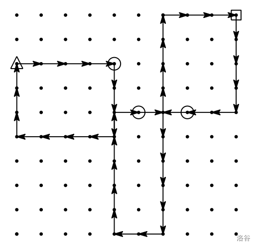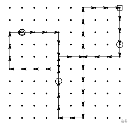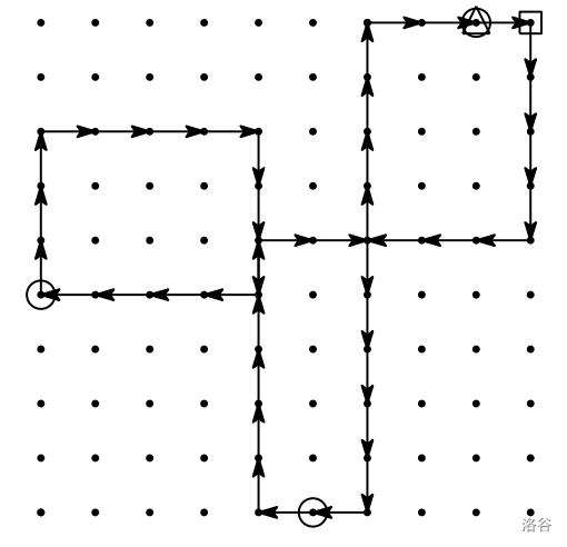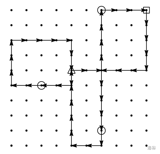 上图是从空中俯瞰该输入示例中 JOI 市的示意图。圆形标记表示公交车的当前位置。箭头表示该公交车的行驶路线。JOI 君的当前位置用三角形标示,目的地比赛会场用四边形标示。