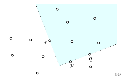 Now, consider a set of points in the plane . We are interested in quadrants defined by the set of points. Specifically, let be the set of quadrants such that the boundary of contains exactly three points of . Each quadrant is called a -quadrant if contains exactly points of in its interior. The figure below shows an example in which the set consists of 14 points (small circles) and you can see a 5-quadrant (shaded in cyan), whose boundary contains three points .