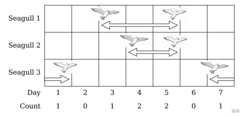 Each seagull comes to the island exactly once a year, stays for a while, and leaves exactly once a year as well. Each seagull has its own schedule of coming and leaving the island, and quite punctually sticks to the schedule. That is, every year, it comes to the island on the same day of the year. Also, every year, it leaves on the same day of the year. Seagulls come to the island early in the morning and leave late in the afternoon. Seagulls that have come to the island may leave on the same day. On the other hand, seagulls may leave the island on one day and come again on the next day.