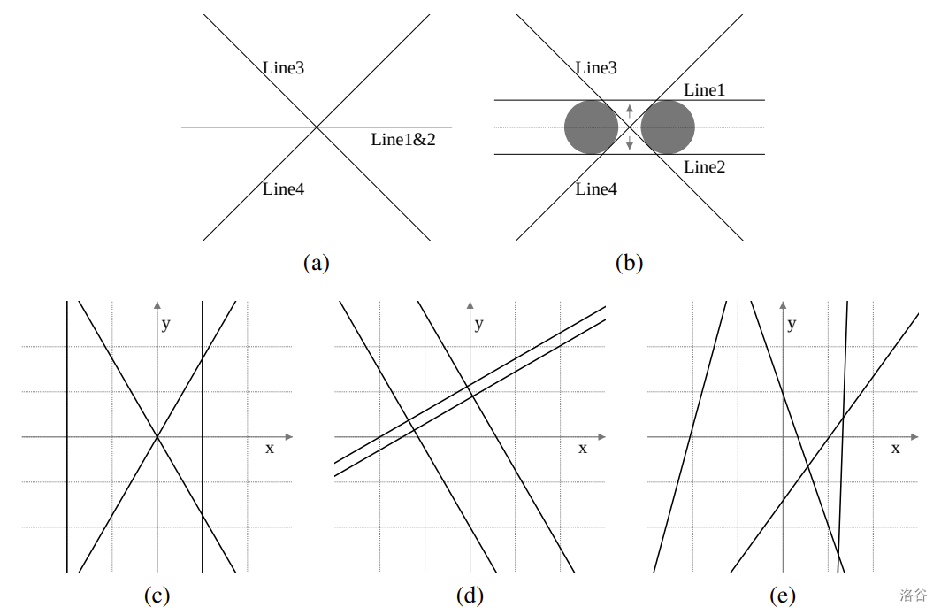 In the first test case of Sample Input 1, you have to move at least one of the first two identical lines (Figure L.1 (a)). For , translating one line by in the positive -direction and the other by in the negative -direction achieves the objective with cost . This results in four tangent lines for disks with radii (Figure L.1 (b)). Since can be arbitrarily small, the minimum required cost is . The remaining cases are illustrated in Figures L.1 (c) to (e).