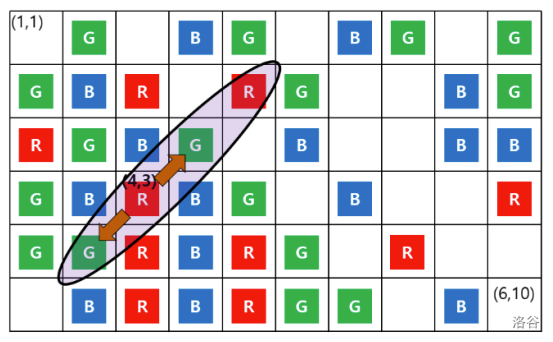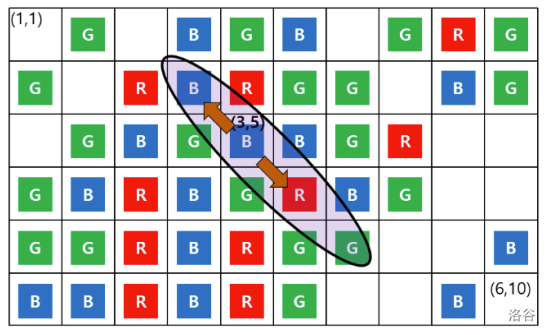 Your program is to read from standard input. The input starts with a line containing two integers, and (), where is the number of rows and is the number of columns of the grid. In the following lines, the -th line contains a string of length , which represents the colors of the cards in the -th row in the grid. Every character in the string is either ‘R’, ‘B’, or ‘G’, which stands for red, blue, or green, respectively.