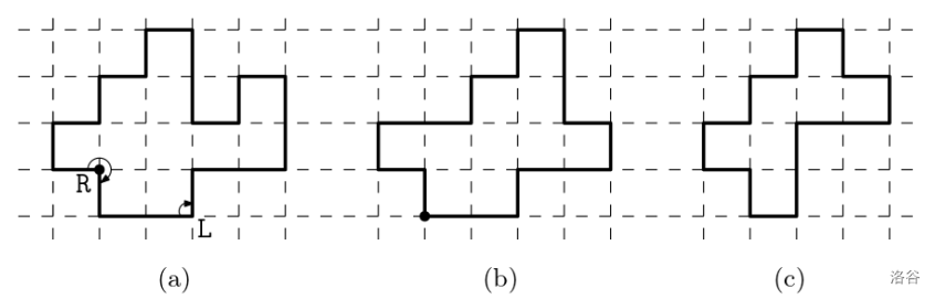 A rectilinear polygon of vertices with integer coordinates realizes a turn sequence of length of two letters L and R if there is a counterclockwise traverse along the boundary of such that the turns at vertices of , encountered during the traverse, form the turn sequence ; the left turn at a convex vertex corresponds to L and the right turn at a reflex vertex corresponds to R. For example, the rectilinear polygon in Figure B.1(a) realizes the turn sequence of length 16. Another turn sequence of length 14 can be realized by rectilinear polygons in Figure B.1(b) and B.1(c). Note that a turn sequence can have infinitely many realizations of rectilinear polygons in the integral plane.