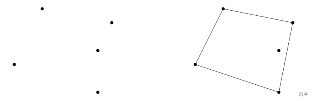 For example, assume that consists of five points as shown in the left of the figure above. There are nine distinct quadrilaterals in total whose corners are members of , while only one of them contains a point of in its interior, as in the right of the figure above. Therefore, there are exactly eight quadrilaterals satisfying the condition and your program must print out 8 as the correct answer.