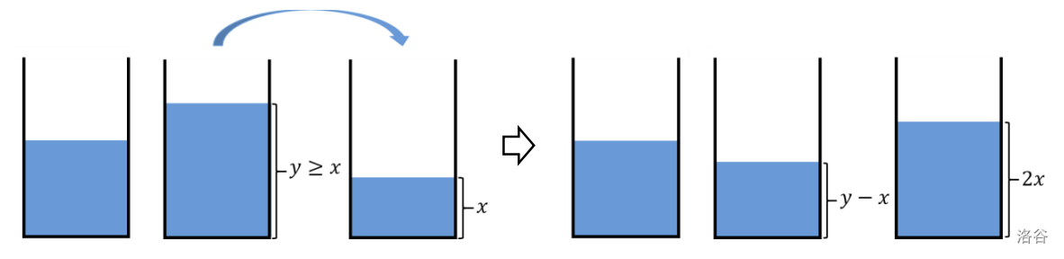 At any time, you can double the amount of one bucket by pouring into it from another one. Specifically, you can pour from a bucket of liters into one of () liters until the latter contains liters and the former does liters. Note that and are always integers and . See the Figure J.1.