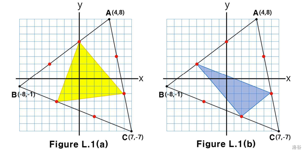 For example, as shown in the figure below, if the coordinates of the three vertices of the given triangle are , , and , the yellow triangle shown in Fig. L.1(a) has the largest area among those that satisfy the condition, and the blue triangle shown in Fig. L.1(b) has the smallest area.